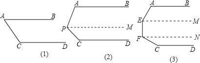 (2)沿P作一条平行AB、CD的平行线PM,由两直线平行,同旁内角互补可得∠A+∠APM=180°,∠MPC+∠C=180°,故∠A+∠APC+∠C=360°;