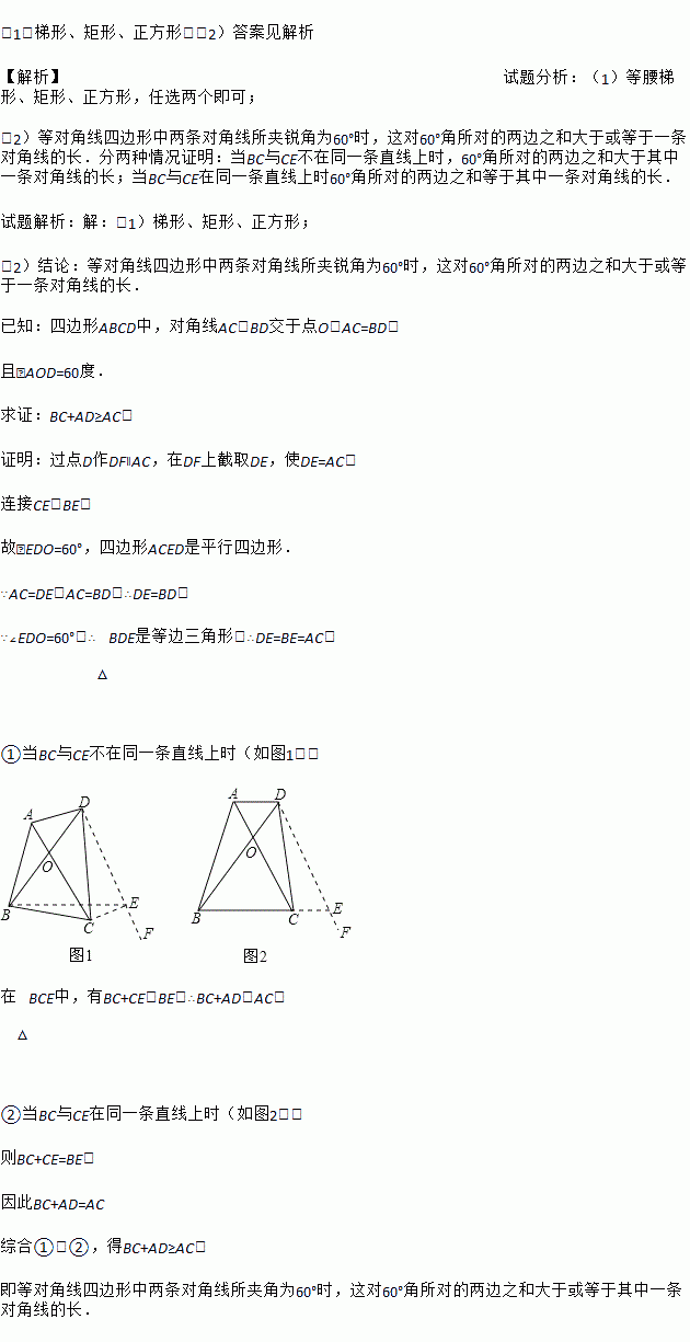 (2)探究:当等对角线四边形中两条对角线所夹锐角为60°时,这对60°角所对的两边之和与其中一条对角线的大小关系,并证明你的结论.