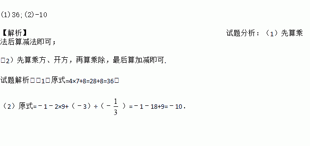 计算:(1)|﹣4|×7﹣(﹣8);(2)﹣14﹣2×.