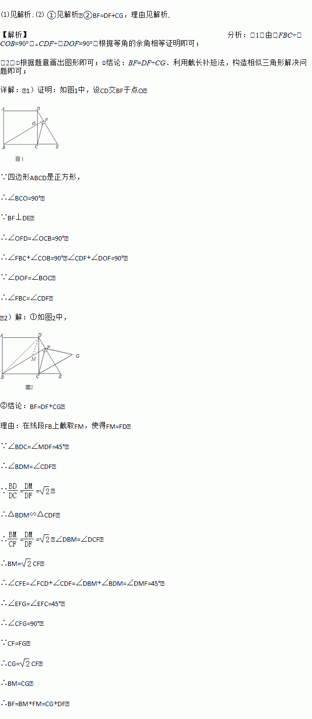 如图1,正方形ABCD中,点E是BC延长线上一点,连接DE,过点B作BF⊥DE于点F,连接FC