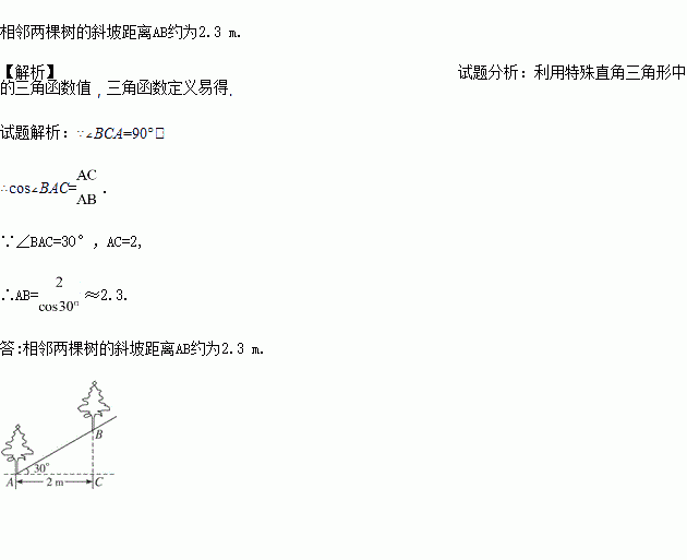 如图,沿倾斜角为30°的山坡植树,要求相邻两棵树的水平距离AC为2 m,那么相邻两棵树的斜坡距离AB约为多少米?(精确到0.1 m,可能用到的数据