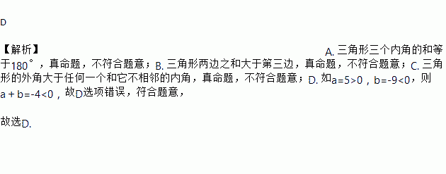 C. 三角形的外角大于任何一个和它不相邻的内角 D. 若a>0,b<0,则a+b>0