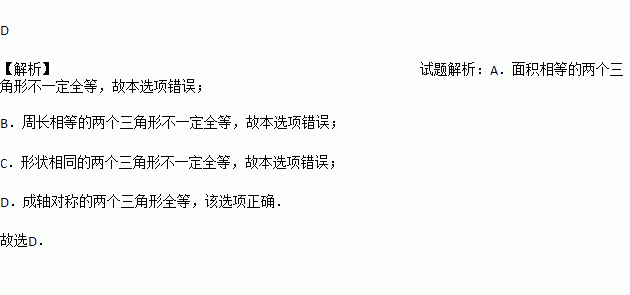 C. 形状相同的两个三角形全等 D. 成轴对称的两个三角形全等