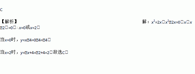 C 【解析】【解析】 x2=2x,x2﹣2x=0,x(x﹣2)=0,∴x=0或x=2. 当x=0时,y=x﹣4=0﹣4=﹣4; 当x=2时,y=﹣x+4=﹣2+4=2.故选C.