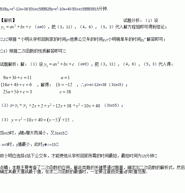 随着地面公交和共享单车的发展,“公交车+单车”的方式已成为很多市民出行的选择。小明放学后从寿春中学出发,先乘坐公交车,根据路面交通的拥堵的实际情况,灵活决定在离家较近的A、B、C、D、E中的某一公交站下车,再骑共享单车回家,设他乘公交车的时间y1(单位:分钟)与下车站点到学校距离x(3≤x≤5)(单位:千米)之间函数关系为y1=2x+2,小明骑单车的时间y2(单位:分钟)与x(3≤x≤5)之间的满足二次函数关系,其具体对应值如下表所示: