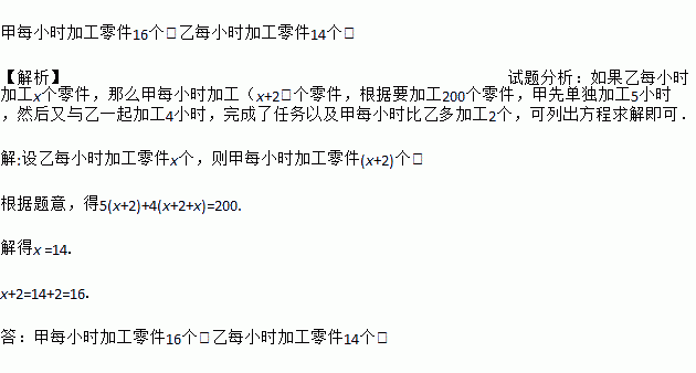 甲每小时加工零件16个,乙每小时加工零件14个. 【解析】试题分析:如果乙每小时加工x个零件,那么甲每小时加工(x+2)个零件,根据要加工200个零件,甲先单独加工5小时,然后又与乙一起加工4小时,完成了任务以及甲每小时比乙多加工2个,可列出方程求解即可. 解:设乙每小时加工零件x个,则甲每小时加工零件(x+2)个. 根据题意,得5(x+2)+4(x+2+x)=200. 解...