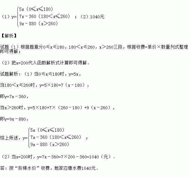 为鼓励居民节约用水,某市对居民用水收费实行“阶梯水价”,按每年用水量统计,不超过180立方米的部分按每立方米5元收费;超过180立方米不超过260立方米的部分按每立方米7元收费;超过260立方米的部分按每立方米9元收费.