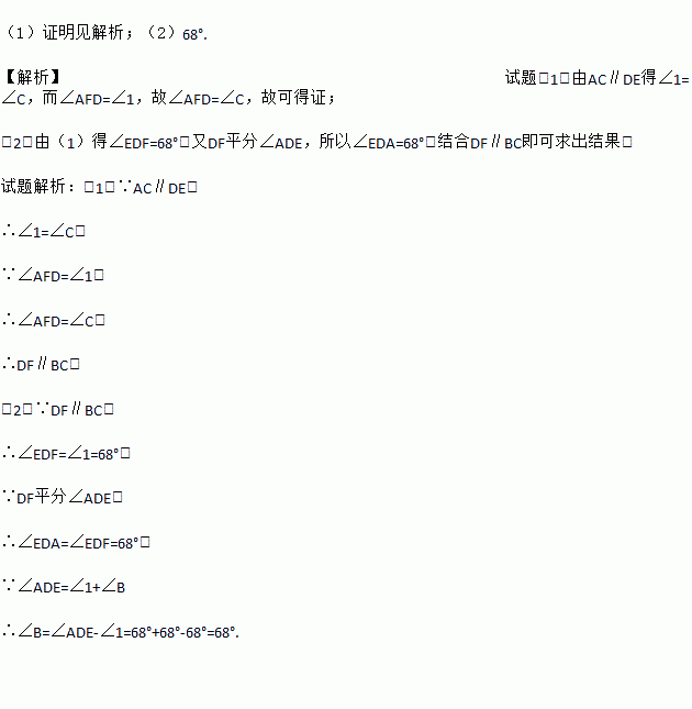 (2)若∠1=68°,DF平分∠ADE,求∠B的度数.