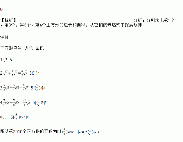 在平面直角坐标系中,第一个正方形ABCD的位置如图6所示,点A的坐标为(1,0),点D的坐标为(0,2).延长CB交x轴于点A1,作第二个正方形A1B1C1C;延长C1B1交x轴于点A2,作第三个正方形A2B2C2C1,…按这样的规律进行下去,第2010个正方形的面积为( )