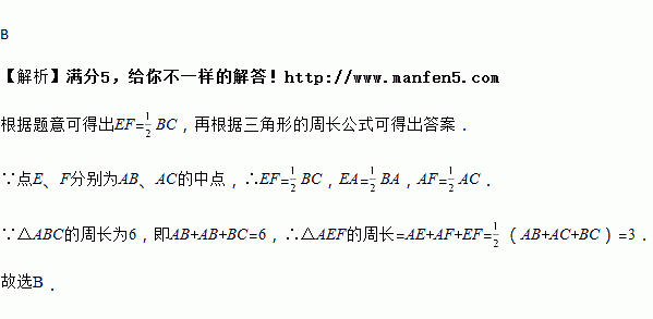 如图,在△ABC中,点E、F分别为AB、AC的中点.若△ABC的周长为6,则△AEF的周长为( )