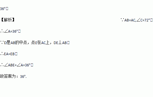 如图,在△ABC中,AB=AC=4,∠C=72°,D是AB的中点,点E在AC上,DE⊥AB,则∠ABE的度数为 .