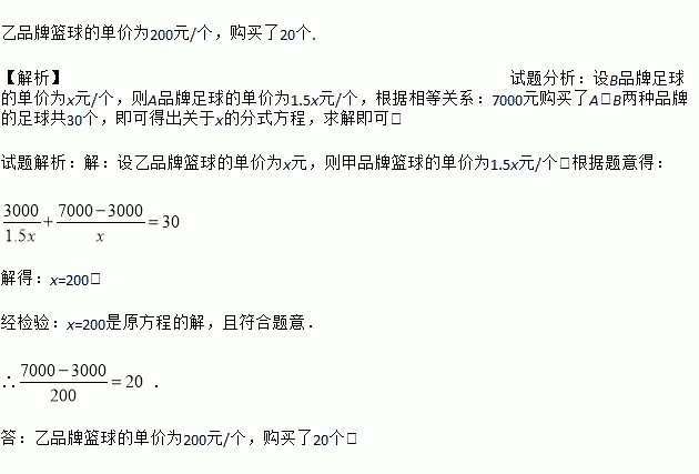 乙品牌篮球的单价为200元/个,购买了20个. 【解析】试题分析:设B品牌足球的单价为x元/个,则A品牌足球的单价为1.5x元/个,根据相等关系:7000元购买了A、B两种品牌的足球共30个,即可得出关于x的分式方程,求解即可. 试题解析:【解析】 设乙品牌篮球的单价为x元,则甲品牌篮球的单价为1.5x元/个,根据题意得: 解得:x=200. 经检验:x=200是原方程的...