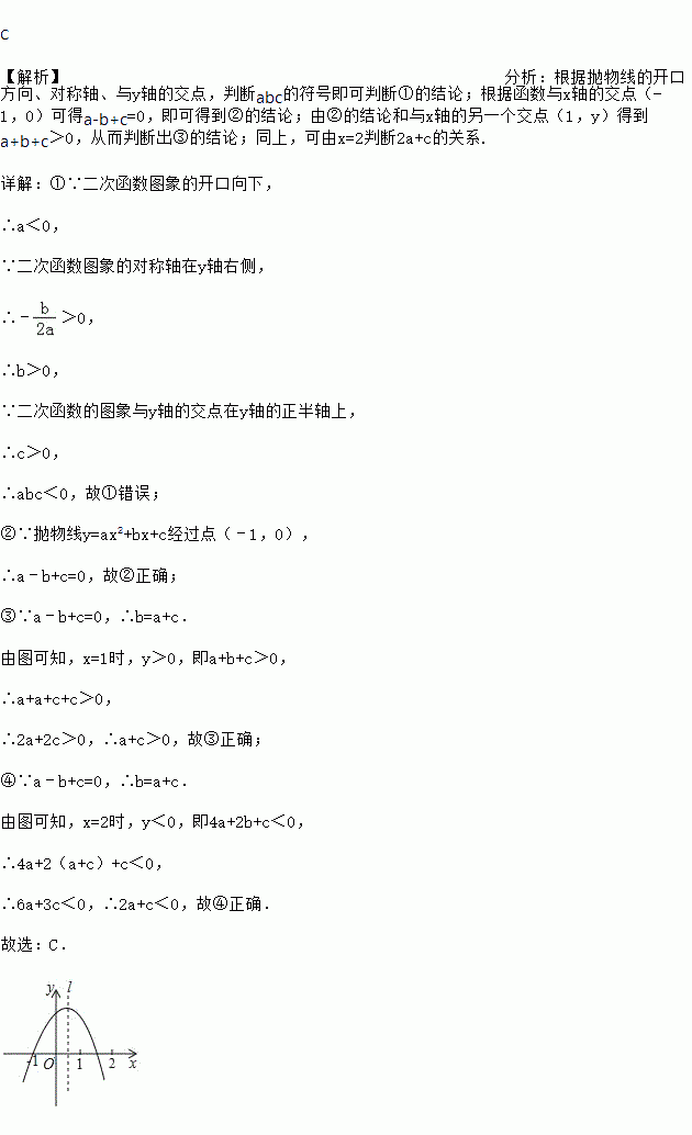 如图,抛物线y=ax2+bx+c经过点(﹣1,0),与x轴的另一个交点在点(1,0)和(2,0)之间,对称轴l如图所示,则下列结论:①abc>0;②a﹣b+c=0;③a+c>0;④2a+c<0,其中正确的结论个数是( )