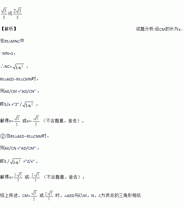 如图,正方形ABCD的边长为2,AE=EB,MN=1,线段MN的两端在CB,CD上滑动,当CM=_________时,△AED与以M,N,C为顶点的三角形相似.