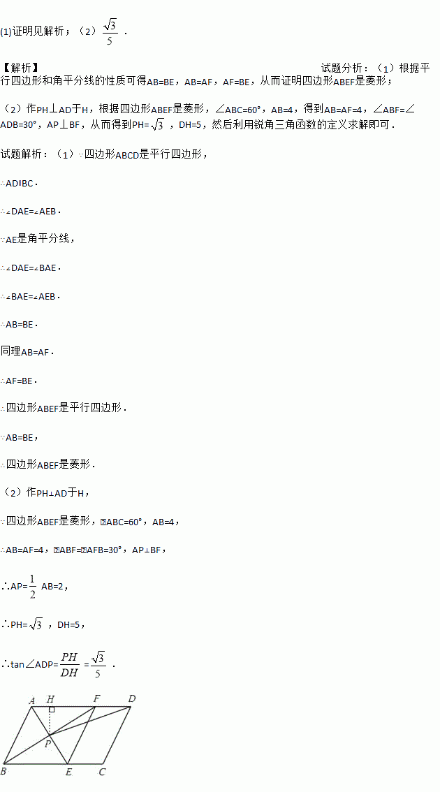 (2)若AB=4,AD=6,∠ABC=60°,求tan∠ADP的值.