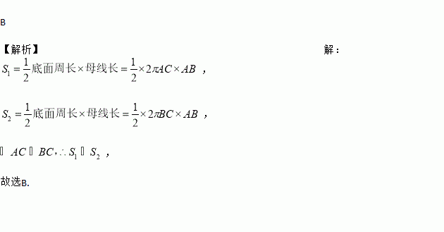如图,在△ABC中,∠C =90°,AC>BC,若以AC为底面圆的半径,BC为高的圆锥的侧面积为S1,若以BC为底面圆的半径,AC为高的圆锥的侧面积为S2 ,则( )