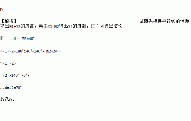 如图,a∥b,∠1=∠2,∠3=40°,则∠4等于( )