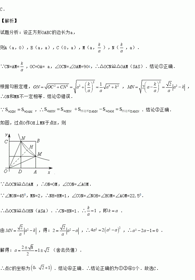 C£® ¡¾½âÎö¡¿ ÊÔÌâ·ÖÎö£ºÉèÕý·½ÐÎOABCµÄ±ß³¤Îªa£¬ ÔòA£¨a£¬0£©£¬B£¨a£¬a£©£¬C£¨0£¬a£©£¬M£¨a£¬£©£¬N£¨£¬a£©£® ¡ßCN=AM=£¬OC=OA= a£¬¡ÏOCN=¡ÏOAM=900£¬¡à¡÷OCN¡Õ¡÷OAM£¨SAS£©£®½áÂÛ¢ÙÕýÈ·£® ¸ù¾Ý¹´¹É¶¨Àí£¬£¬£¬¡àONºÍMN²»Ò»¶¨ÏàµÈ£®½áÂÛ¢Ú´íÎó£® ¡ß£¬¡à£®½áÂÛ¢ÛÕýÈ·£® Èçͼ£¬¹ýµãO×÷OH¡ÍMNÓÚµãH£¬Ôò ¡ß¡÷...