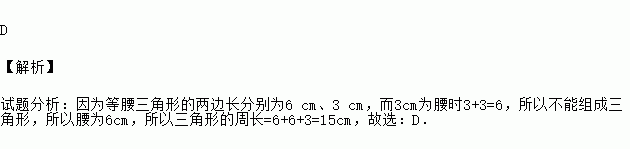 已知等腰三角形的两边长分别为6 cm、3 cm,则该等腰三角形的周长是( )