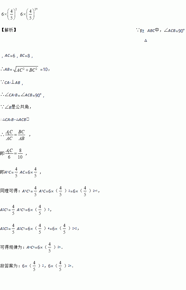 如图,已知Rt△ABC中,∠ACB=90°,AC=6,BC=8,过直角顶点C作CA1⊥AB,垂足为A1,再过A1作A1C1⊥BC,垂足为C1,过C1作C1A2⊥AB,垂足为A2,再过A2作A2C2⊥BC,垂足为C2,…,这样一直作下去,得到了一组线段CA1,A1C1,C1A2,A2C2,…,AnCn,则A1C1=_________,AnCn=__________ .