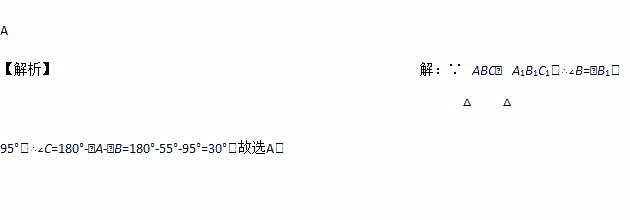 已知△ABC∽△A1B1C1,且∠A=55°,∠B1=95°,则∠C等于( )