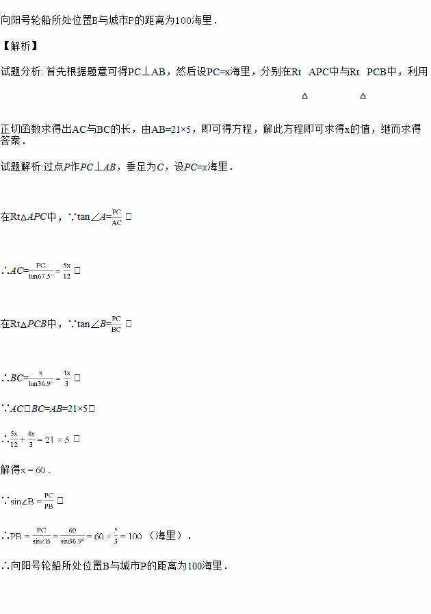 马航MH370 客机“失联”,我国“海巡01号”前往搜寻。如图某天上午9时,“海巡01号” 轮船位于A处,观测到某小岛P位于轮船的北偏西67.5°,轮船以21海里/时的速度向正北方向行驶,下午2时该船到达B处,这时观测到小岛P位于该船的南偏西30°方向,求此时轮船所处位置B与小岛P的距离?(精确到0.1)