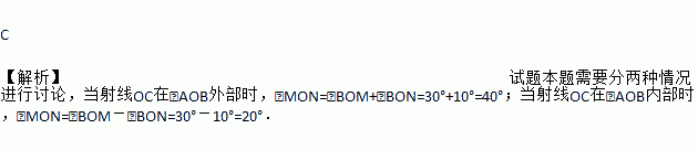 已知∠AOB=60°,其角平分线为OM,∠BOC=20°,其角平分线为ON,则∠MON的大小为( )