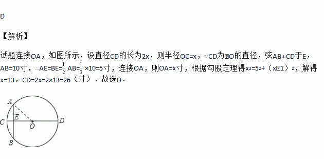 “圆材埋壁”是我国古代著名的数学著作《九章算术》中的一个问题,“今有圆材,埋在壁中,不知大小,以锯锯之,深一寸,锯道长一尺,问锯几何?”用现代的数学语言表述是:“如图,CD为⊙O的直径,弦AB⊥CD垂足为E,CE=1寸,AB=10寸,求直径CD的长”,依题意,CD长为( )