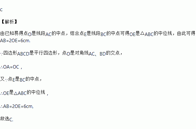 如图,?ABCD中,对角线AC,BD交于点O,点E是BC的中点.若OE=3 cm,则AB的长为( )