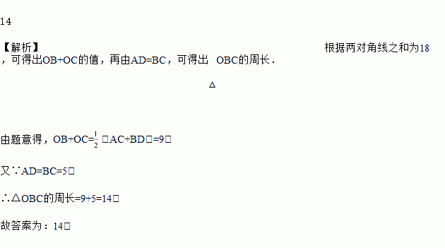 如图,□ABCD的对角线相交于点O,两条对角线的和为18,AD的长为5,则△OBC的周长为 ___________.