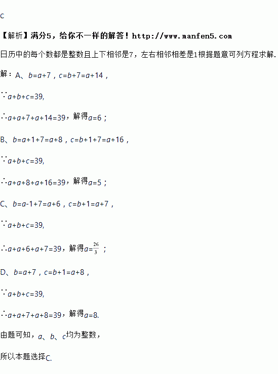 今年某月的月历上圈出了相邻的三个数a、b、c,并求出了它们的和为39,这三个数在月历中的排布不可能是( )