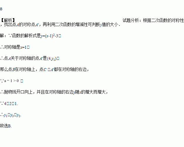 设A(﹣2,y1),B(1,y2),C(2,y3)是抛物线y=(x-1)2-3上的三点,则y1,y2,y3的大小关系为( )