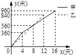 分析:由图象可知,乙铺了12天,共840米,甲铺路16天,要求甲铺路多少,需求出他的第二部分的解析式,因此需求出乙过点(12,840)的解析式,然后求出两直线的交点(8,560),再利用点(4,360),求出甲的解析式,令其中x=16,即可求出甲铺路多少,然后就可求出答案.