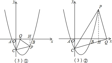 (3)由于抛物线向x轴正方形平移,那么点P必在y轴右侧,若△CPQ是以CP为斜边的等腰直角三角形,那么点Q必须在x轴正半轴上,然后分两种情况讨论: