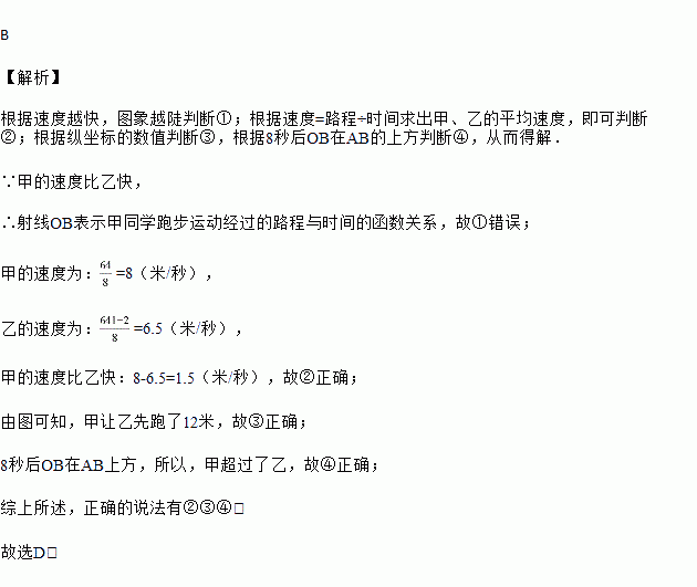 如图,OB,AB表示甲、乙两名同学运动的一次函数图象,图中s和t分别表示运动路程和时间,已知甲的速度比乙快,下列说法:①射线AB表示甲的路程与时间的函数关系;②甲的速度比乙快1.5 m/s;③乙在甲前面12 m处起跑;④ 8 s后,甲超过了乙.其中正确的说法是( )