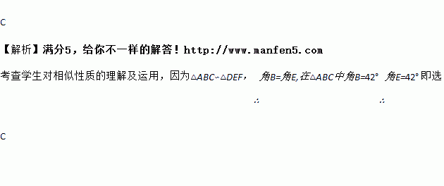 如图所示,若△ABC∽△DEF,则∠E的度数为( )