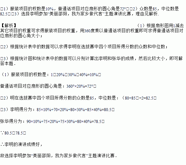 (1)求服装项目的权数及普通话项目对应扇形的圆心角大小;