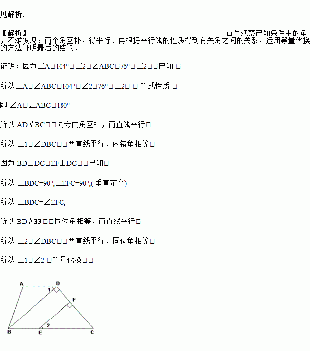 如图,在四边形ABCD中,∠A=104°-∠2,∠ABC=76°+∠2,BD⊥CD于D,EF⊥CD于F.