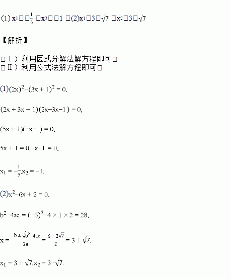 (1)4x2-(3x+1)2=0; (2)x2-6x+2=0.