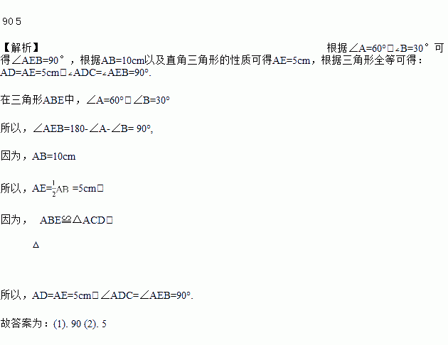 如图,△ABE≌△ACD,AB=10cm,∠A=60°,∠B=30°,则∠ADC=________°,AD=________cm.