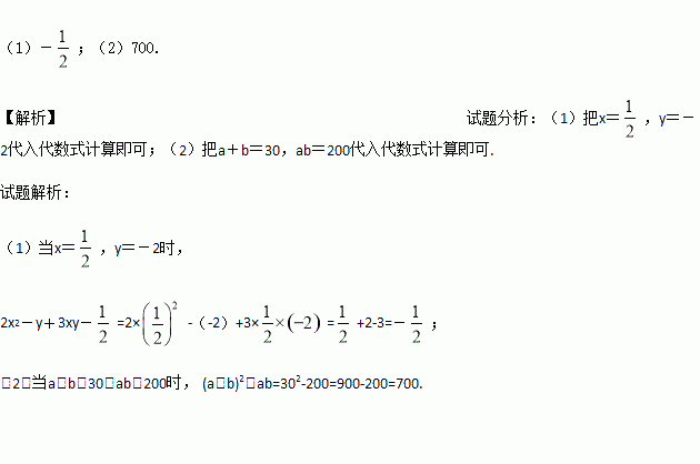 (1)当x=,y=-2时,求代数式2x2-y+3xy的值;