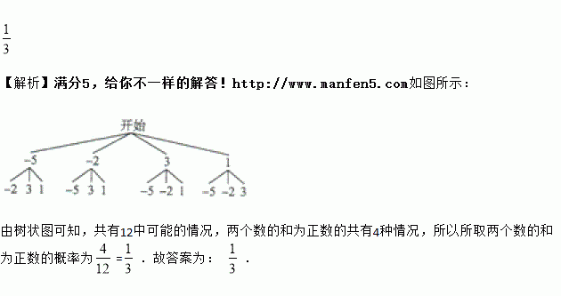 分别从数﹣5,﹣2,1,3中,任取两个不同的数,则所取两数的和为正数的概率为_______.
