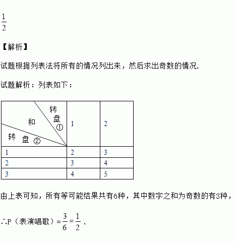 九年级(1)班要举行一场毕业联欢会,规定每个同学同时转动下图中①、②两个转盘(两个转盘分别被二等分和三等分),若两个转盘停止后指针所指的数字之和为奇数,则这个同学要表演唱歌节目;若数字之和为偶数,则要表演其他节目.试求出这个同学表演唱歌节目的概率(要求用画树状图或列表方法求解).