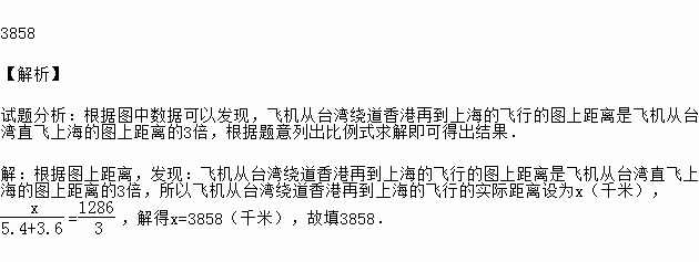 在中国地理地图册上,连接上海、香港、台湾三地构成一个三角形,用刻度尺测得它们之间的距离如图所示.飞机从台湾直飞上海的距离约为1 286千米,那么飞机从台湾绕道香港再到上海的飞行距离约为 _________ 千米.