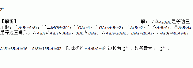 如图,已知∠MON=30°,点A1,A2,A3,…在射线ON上,点B1,B2,B3,…在射线OM上,△A1B1A2,△A2B2A3,△A3B3A4,…均为等边三角形,若OA2=4,则△AnBnAn+1的边长为__________.