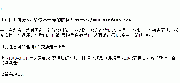 将正方体骰子(相对面上的点数分别为1和6、2和5、3和4)放置于水平桌面上,如图1。在图2中,将骰子向右翻滚90°,然后在桌面上按逆时针方向旋转90°,则完成一次变换。若骰子的初始位置为图1所示的状态,那么按上述规则连续完成14次变换后,骰子朝上一面的点数是_____________________。