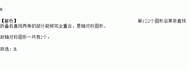 B 【解析】第1,2个图形沿某条直线折叠后直线两旁的部分能够完全重合,是轴对称图形, 故轴对称图形一共有2个。 故选:B.