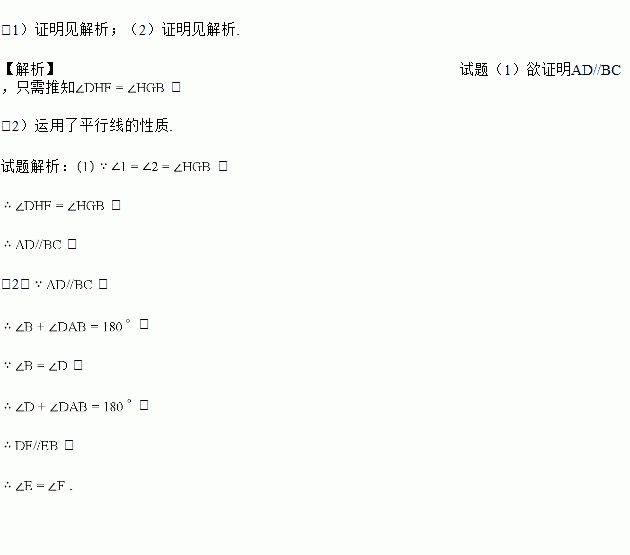 如图,点E为BA 延长线上的一点,点F 为DC延长线上的一点,EF 交BC 于点G,交AD 于点H,若∠1=∠2,∠B=∠D.