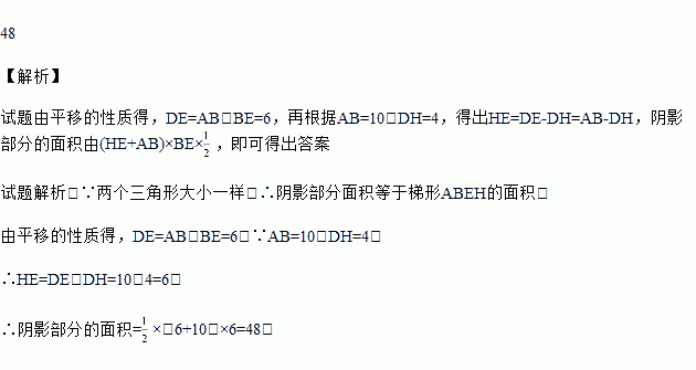 两个直角三角形重叠在一起,将其中一个三角形沿着点B到点C的方向平移到△DEF的位置,AB=10,DO=4,平移距离为6,阴影部分的面积为__________