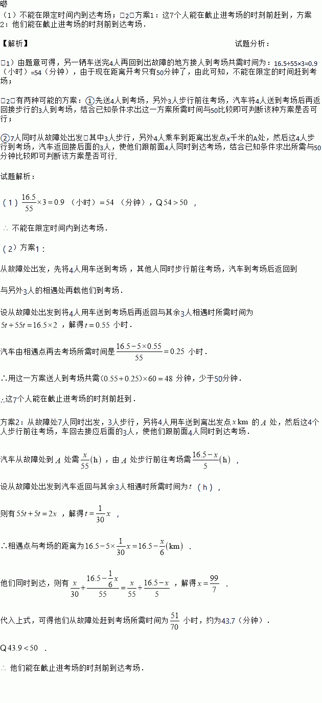 ΪÃñÖÐѧ×âÓÃÁ½Á¾ËÙ¶ÈÏàͬµÄСÆû³µËÍ1Ãû´ø¶ÓÀÏʦºÍ6ÃûѧÉúµ½³ÇÇøÖÐѧ²Î¼ÓÊýѧ¾ºÈü£¬Ã¿Á¾ÏÞ×ø4ÈË£¨²»°üÀ¨Ë¾»ú£©£®ÆäÖÐÒ»Á¾Ð¡Æû³µÔÚ¾àÀ뿼³¡16.5 kmµÄµØ·½³öÏÖ¹ÊÕÏ£¬´ËʱÀë½ØÖ¹½ø¿¼³¡µÄʱ¿Ì»¹ÓÐ50·ÖÖÓ£¬ÕâʱΨһ¿ÉÀûÓõĽ»Í¨¹¤¾ßÊÇÁíÒ»Á¾Ð¡Æû³µ£¬ÇÒÕâÁ¾³µµÄƽ¾ùËÙ¶ÈÊÇ55 km/h£¬È˲½ÐеÄËÙ¶ÈÊÇ5 km/h£¨ÉÏ¡¢Ï³µÊ±¼äºöÂÔ²»¼Æ£©£®